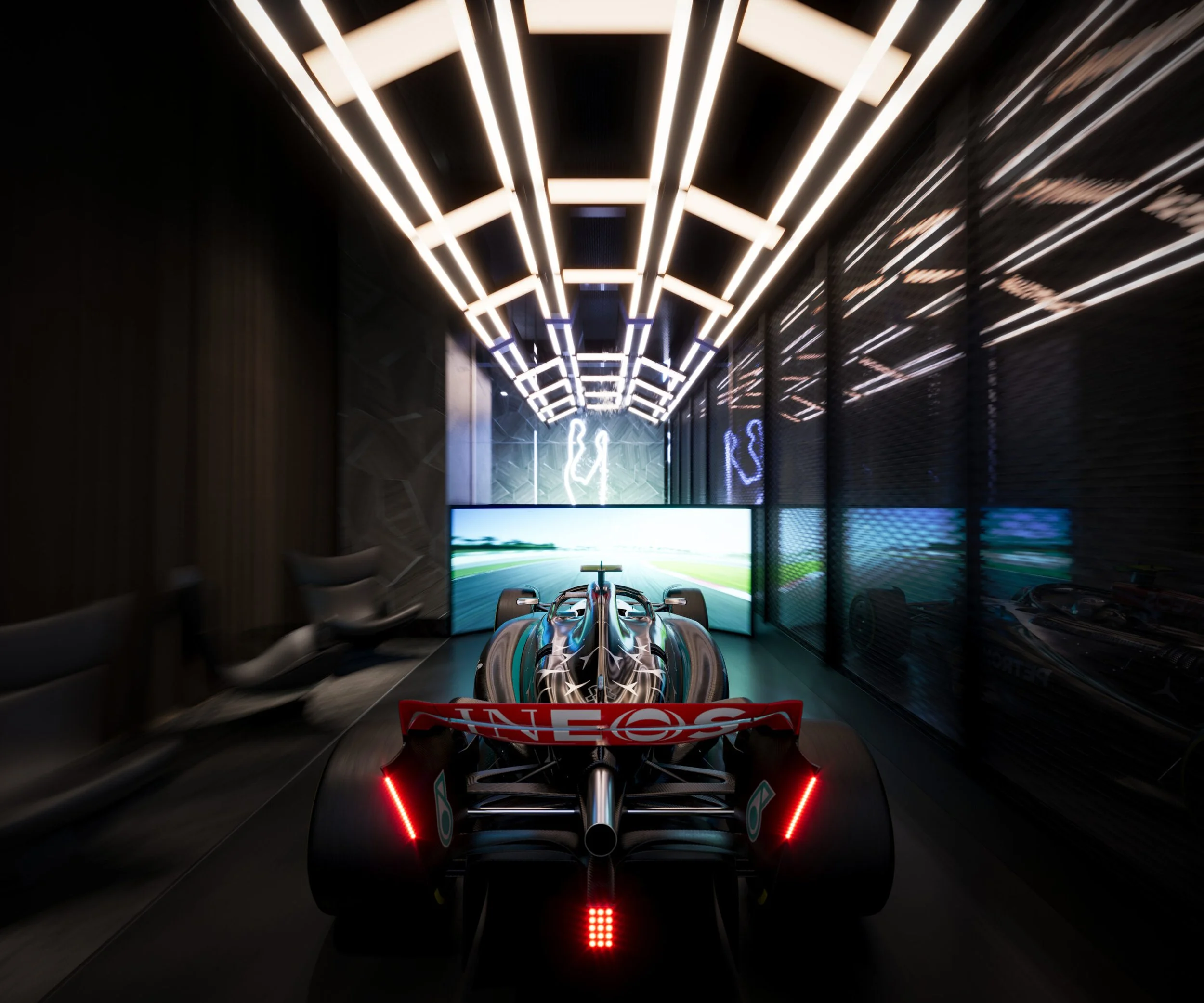 Unleash your inner thrill-seeker with a custom Mercedes-Benz race car simulator—just one of the standout features in over 130,000 square feet of multi-level common spaces designed to energize and connect residents and the community alike